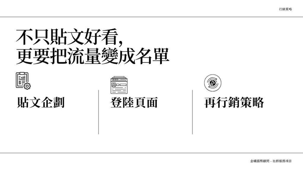 金礦團隊整合「內容企劃、廣告投放、名單蒐集與銷售支援」,以專案模式協助企業把 社群平台變成可預期的 B2B 潛在客戶來源。